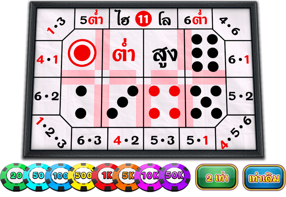 การแทง 123 456 คือ การแทงแต้มรวมของลูกเต๋าทั้ง 3 ลูก แล้วถูก 2 ตัว เมื่อออกแต้มที่แทงไว้จะได้ ×1 ของชิปที่เดิมพัน